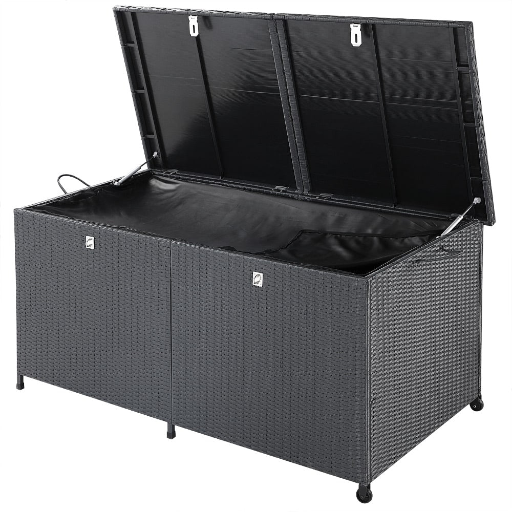 Opbevaringsboks til haven Polyrattan – vejrbestandig, UV-lysbestandig, smudsafvisende 2-delt låg (kan bruges separat og tilsluttes) 2 praktiske håndtag + 2 hjul også velegnet som bænk Indvendig foring lukket med velcro: aftagelig og med lynlås vandtæt be